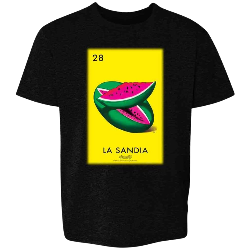 Fun Lotería Design: Features the iconic "La Sandia" watermelon card from the classic Mexican bingo game.
